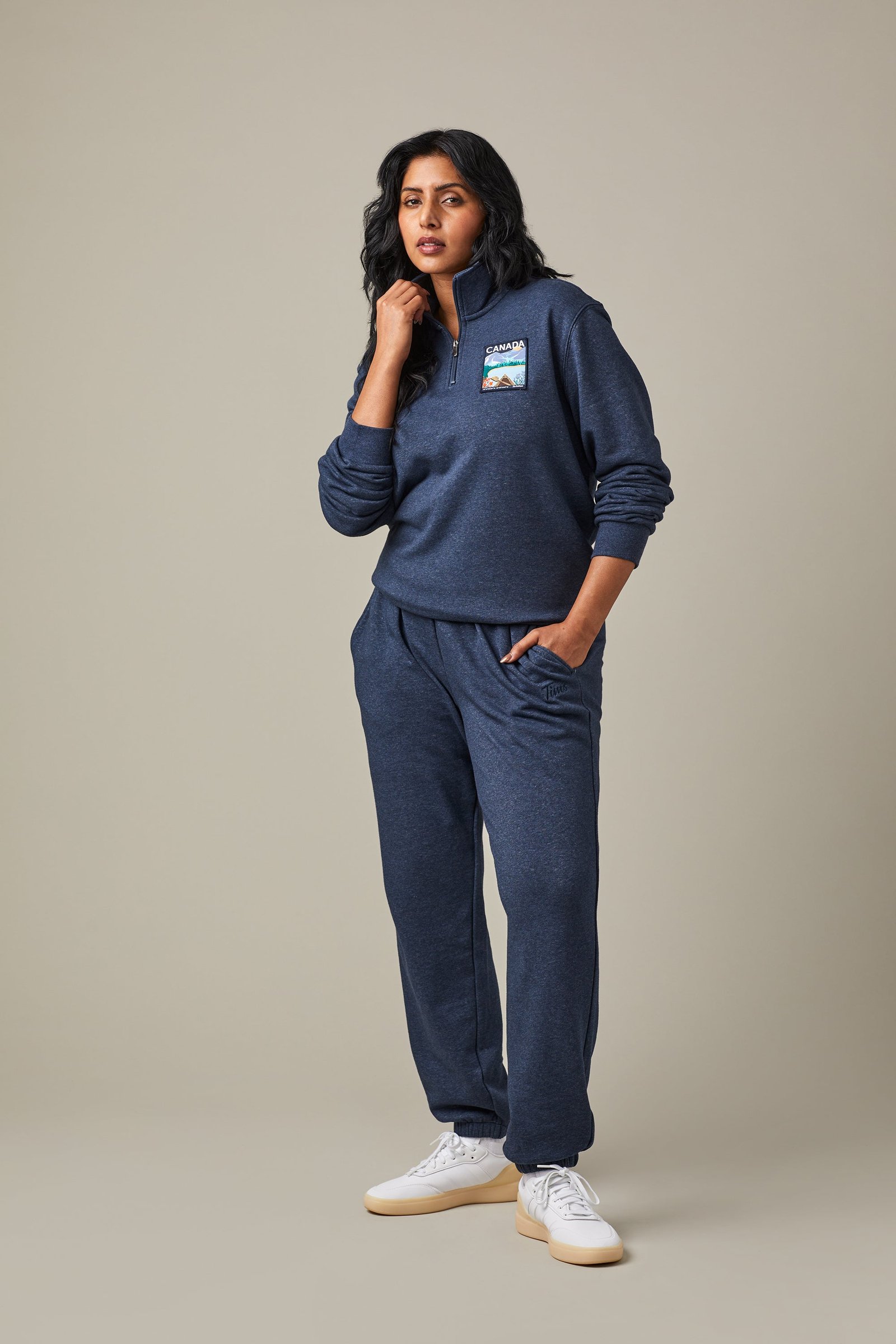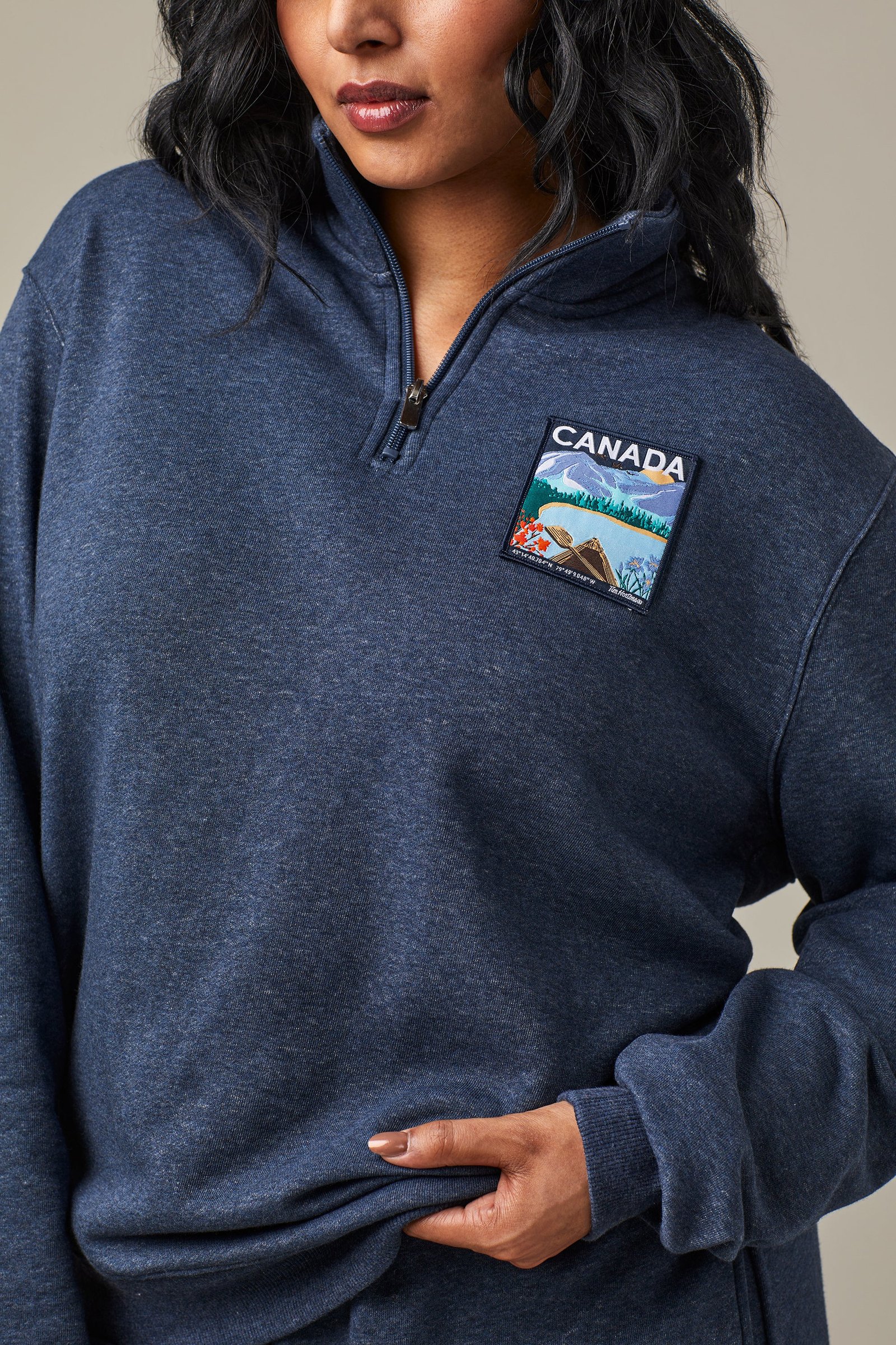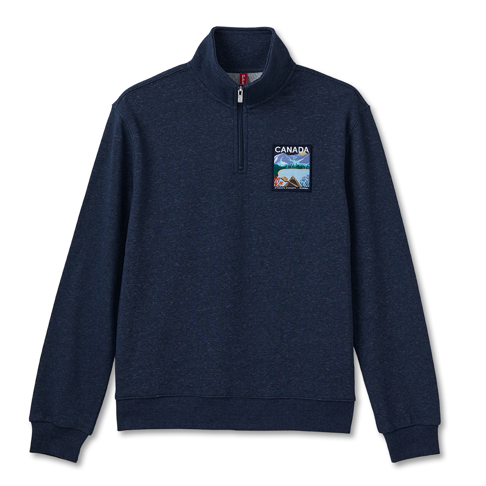 Stay warm. look great. and wear your love for Canada proudly. with the Tim Hortons French terry quarter zip. Comfortable. unisex. and ideal for everyday use. it’s available in classic navy.